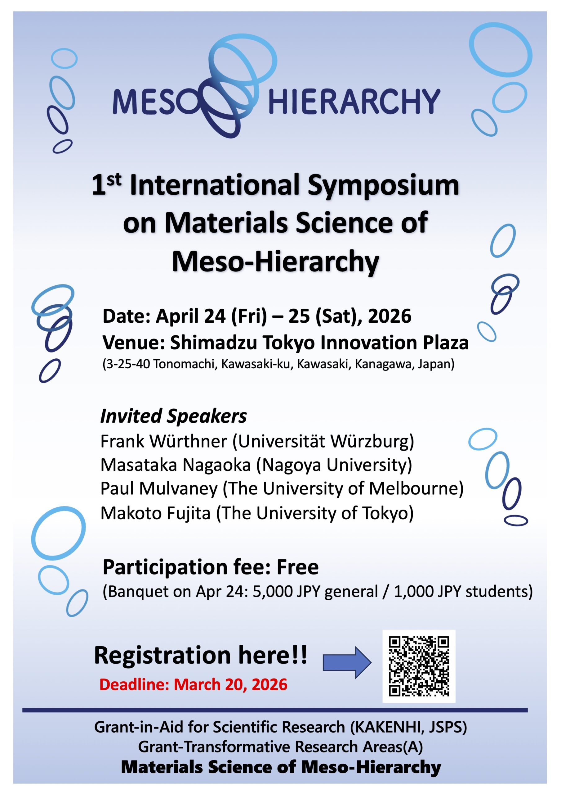 An international symposium on “Materials Science of Mesohierarchy” will be held on April 24 (Fri) – 25 (Sat), 2026. In addition to invited lectures from distinguished researchers both in Japan and overseas, this symposium will also feature presentations of research achievements by members of the “Materials Science of Mesohierarchy” project. We hope this event will serve as a valuable opportunity to widely share the endeavors of our project with all participants. We look forward to your active participation.