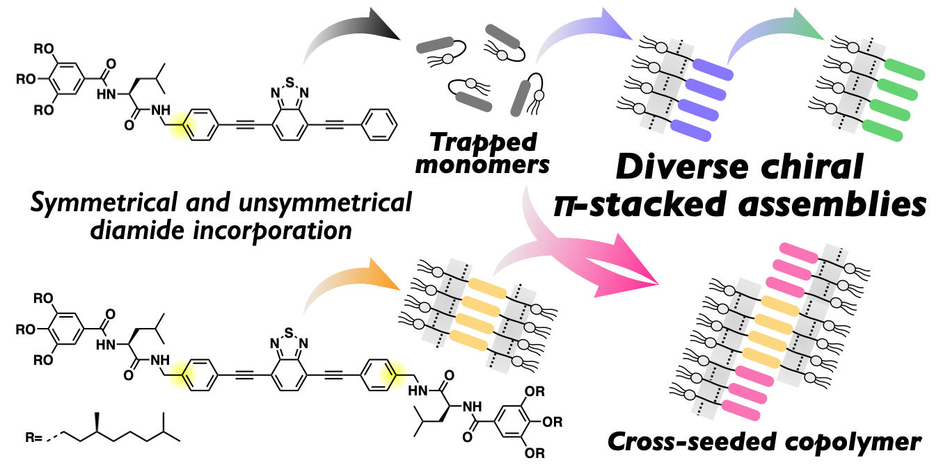 OGI (C01) et al. have published their research on seeded polymerization of π-conjugated systems with symmetrical/unsymmetrical incorporation of leucine-based diamides yielding three distinct chiral assemblies in Chemical Communications.