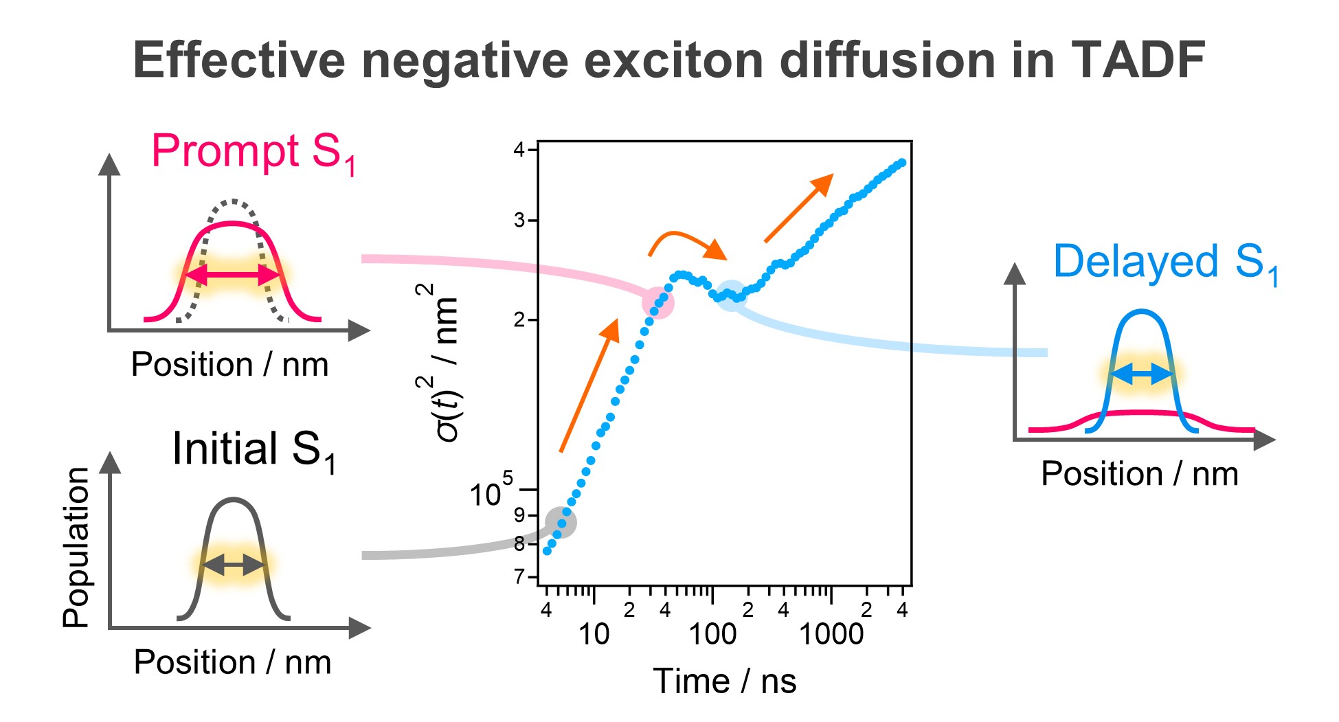 五月女(A03)らの、熱活性化遅延蛍光(TADF)材料における「負の励起子拡散」に関する研究成果がJ. Phys. Chem. Lett.に掲載されました。